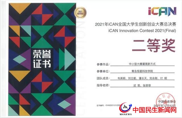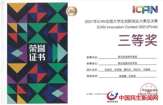 中國民生新聞網(wǎng)訊 近日,在剛剛結(jié)束的ICAN全國大學(xué)生創(chuàng)新創(chuàng)業(yè)大賽總決賽中,青島恒星科技學(xué)院參賽團隊榮獲一等獎1項,二等獎1項,三等獎1項的好成績,突破本賽事歷史最好成績。