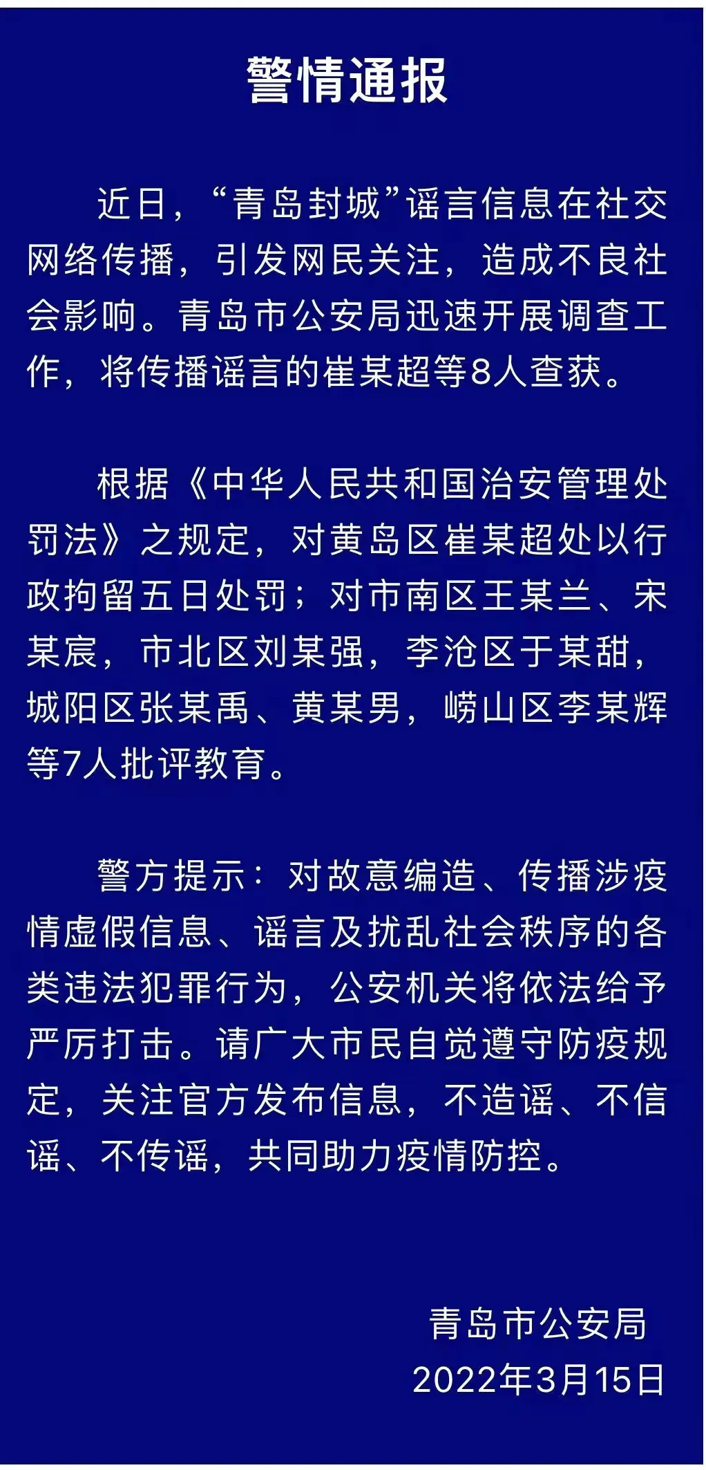 近日,“青島封城”謠言信息在社交網(wǎng)絡(luò)傳播,引發(fā)網(wǎng)民關(guān)注,造成不良社會(huì)影響。青島市公安局迅速開展調(diào)查工作,將傳播謠言的崔某超等8人查獲。