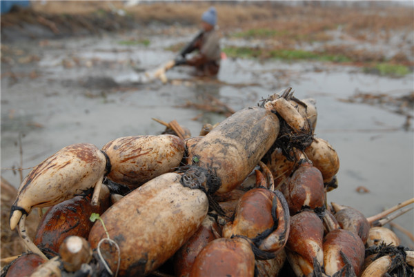 12月2日,寒風(fēng)料峭,冬意濃濃。山東青島市即墨區(qū)靈山街道大河套村的160畝無公害淺水藕種植田里,卻是一派繁忙的景象,一筐筐鮮嫩的藕從秧田里刨出來,被來來往往的車輛運走。