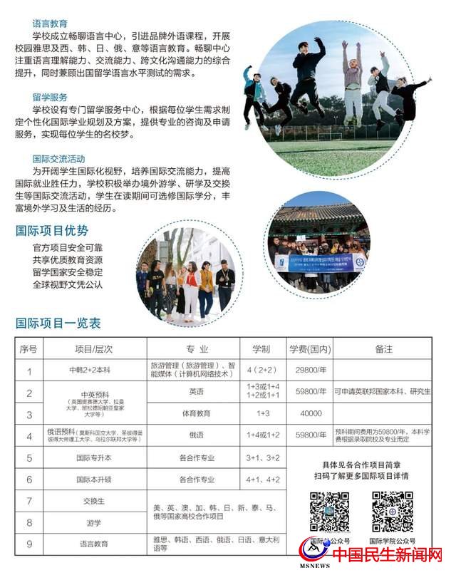 為提升學(xué)校國(guó)際化教育教學(xué)水平,大力培養(yǎng)具有國(guó)際化素養(yǎng)的高層次應(yīng)用型人才,學(xué)校先后與莫斯科國(guó)立大學(xué)、德國(guó)德累斯頓大學(xué)、英國(guó)提賽德大學(xué)、烏拉爾聯(lián)邦大學(xué)、圣彼得堡彼得大帝理工大學(xué)、加拿大萊姆頓學(xué)院、澳大利亞南十字星大學(xué)、韓國(guó)崇實(shí)大學(xué)、全州大學(xué)等等16個(gè)國(guó)家的60余所高校開(kāi)展國(guó)際交流與合作,優(yōu)質(zhì)的國(guó)際教育資源、濃厚的國(guó)際化氛圍和一站式的國(guó)際化教育平臺(tái),為學(xué)生國(guó)際化素養(yǎng)的培養(yǎng)提供了良好條件,學(xué)生在畢業(yè)前達(dá)到要求,即可申請(qǐng)到國(guó)外知名大學(xué)攻讀本科或碩士學(xué)位。