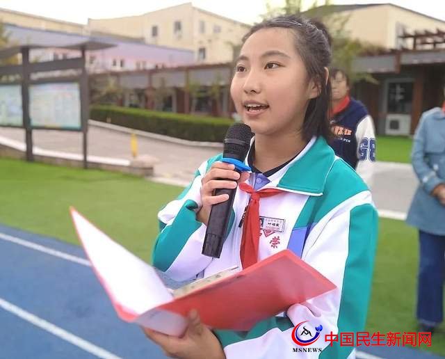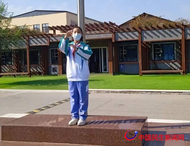 當中國少年先鋒隊隊歌前奏響起時,少先隊員們伴隨著樂曲歌唱:“我們是共產(chǎn)主義接班人,繼承革命先輩的光榮傳統(tǒng),愛祖國,愛人民,鮮艷的紅領(lǐng)巾飄揚在前胸……”,驕傲自豪的心情在心中激蕩,隊員葉碩雯指揮。