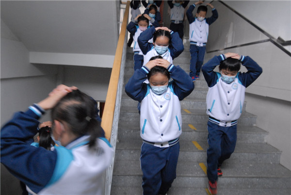 上午10點,急促刺耳的警報聲突然響起,打斷了原本沉浸在課堂里的孩子們。聽到地震警報,學(xué)校應(yīng)急小組各成員立即按照職責(zé)分工指揮避震疏散,在辦公室里候課的老師立即趕到每層樓梯拐角處,護(hù)導(dǎo)撤離的同學(xué);班主任指揮學(xué)生先在室內(nèi)緊急避險。緊急疏散警報后,每班靠前后門的兩位同學(xué)立即把門打開,教師迅速將全班同學(xué)分成兩路縱隊,并指揮學(xué)生有秩序撤離,疏散時每位同學(xué)都用雙手保護(hù)頭部,并隨時注意觀察頭頂上方的情況,防止跌落的燈具、磚瓦砸傷。2分鐘后全體同學(xué)們已經(jīng)疏散出教學(xué)樓,集結(jié)在操場安全區(qū)。疏散到操場的學(xué)生在班主任老師的帶領(lǐng)下,整隊、清點人數(shù),全校學(xué)生無一人掉隊,師生全部到達(dá)指定安全位置。