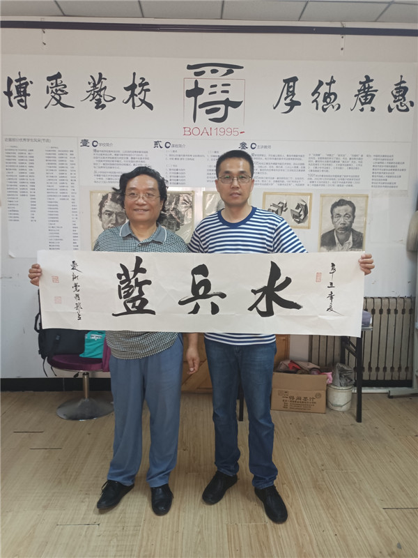 接過(guò)郭立先生的“水兵藍(lán)”作品,周學(xué)禮表示要好好珍惜書(shū)法家給自己的鼓勵(lì)和鞭策,自己一定好好努力,將“水兵藍(lán)”掛在自己的辦公室。每天有郭立先生的榜樣作參照,自己也會(huì)有無(wú)窮的力量,將“水兵藍(lán)”做強(qiáng)做大,無(wú)愧當(dāng)兵的歷史。