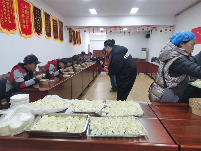 儀式舉行完畢,大家移步二樓社區(qū)活動(dòng)室圍坐一起,邊包餃子邊話家常,節(jié)日氛圍濃厚。熱氣騰騰的餃子出鍋后,騎手們與社區(qū)居民和參會(huì)人員齊聚一堂,共享美味,暖意洋溢。