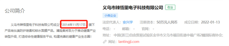 據(jù)瀾庭集目前的官網(wǎng)顯示,義烏市辣悟里電子科技有限公司成立于2014年11月17日。這句話明顯和現(xiàn)實(shí)存在矛盾,因?yàn)榱x烏市辣悟里電子科技有限公司的實(shí)際成立時(shí)間是在2022年1月13日。