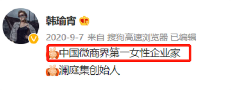 現(xiàn)如今,她的身上還貼上了如下標(biāo)簽:“縱美、鈺盈堂、卡祖等品牌創(chuàng)始人”、“中國(guó)傳奇創(chuàng)業(yè)風(fēng)云人物”、“中國(guó)微商界第一女性企業(yè)家”。值得一提的是,韓瑜宵本人在其微博中也自稱(chēng)為“中國(guó)微商界第一女性企業(yè)家”。