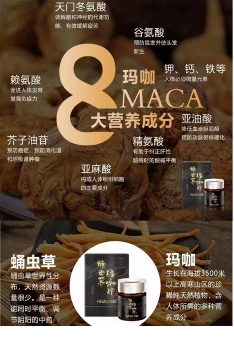 過(guò)去這些年里,在瀾庭集旗下大健康產(chǎn)品品類(lèi)當(dāng)中銷(xiāo)售得最為火爆的產(chǎn)品當(dāng)屬“卡祖蛹蟲(chóng)草瑪咖片”,據(jù)代理商提供的宣傳材料介紹,該產(chǎn)品具有“改善陽(yáng)痿早泄,提高性能力,緩解前列腺炎,提高精子數(shù)量與質(zhì)量、提高生殖力,預(yù)防及緩解腰間盤(pán)突出,改善脫發(fā)、少白頭、幫助生發(fā),改善失眠多夢(mèng),改善氣色差、精氣神不足”等多種保健及醫(yī)療作用。