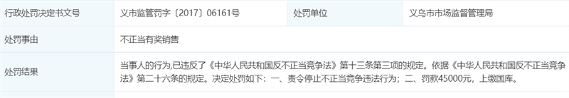 繼續(xù)往前追溯,在2017年9月,瀾庭集還曾因不正當(dāng)有獎(jiǎng)銷(xiāo)售,遭到過(guò)義烏市市場(chǎng)監(jiān)督管理局的處罰:責(zé)令停止不正當(dāng)競(jìng)爭(zhēng)違法行為;罰款45000元,上繳國(guó)庫(kù)。決定書(shū)文號(hào):義市監(jiān)管罰字〔2017〕06161號(hào)。