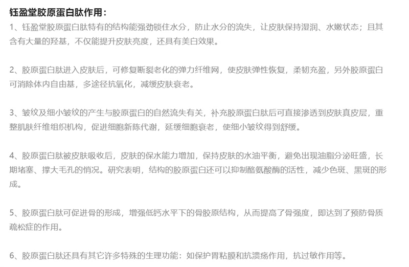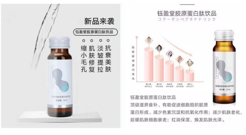 再比如鈺盈堂膠原蛋白肽飲品,據(jù)相關(guān)公眾號(hào)介紹,該款產(chǎn)品具有以下多種作用:可以提升皮膚亮度,具有美白功效;可以減緩皮膚衰老;可以提高骨強(qiáng)度,預(yù)防骨質(zhì)疏松癥;可以保護(hù)胃黏膜,具有抗?jié)?、抗過(guò)敏的作用等等。