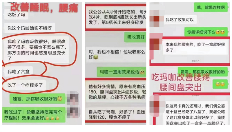 但在眼下,在經(jīng)銷(xiāo)商發(fā)布的朋友圈中,還是有不少案例為該產(chǎn)品的醫(yī)療功效佐證。比如有用了五盒瑪咖的老人長(zhǎng)出了頭發(fā),高血壓也正常了;又比如還有一位消費(fèi)者用了六盒瑪咖后,發(fā)現(xiàn)睡眠改善了很多,腰也不怎么痛了;甚至還有一位顧客在吃了一盒瑪咖后,原本患有的腰間盤(pán)突出都好了。