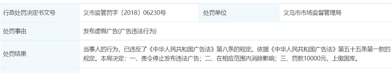 在2018年7月份,瀾庭集公司還曾因發(fā)布“誰(shuí)說(shuō)一萬(wàn)塊錢(qián)不能做大生意,2018小成本、高利潤(rùn)的創(chuàng)業(yè)項(xiàng)目(小成本、零庫(kù)存、無(wú)店面、高利潤(rùn))”等虛假?gòu)V告,違反了《廣告法》第八條的規(guī)定,遭到了義烏市市場(chǎng)監(jiān)督管理局的行政處罰:責(zé)令停止發(fā)布違法廣告;在相應(yīng)范圍內(nèi)消除影響;罰款10000元,上繳國(guó)庫(kù)。決定書(shū)文號(hào):義市監(jiān)管罰字〔2018〕06230號(hào)。