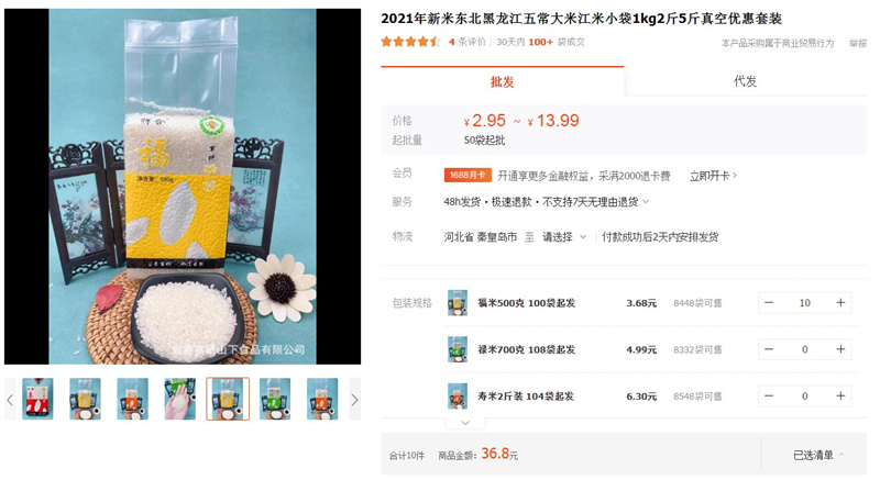 我們在積分商城中隨機挑選了兩款產(chǎn)品分別為寒地硒米及高寒燕麥片,進行了產(chǎn)品信息查詢,中國有機谷積分商城中寒地硒米價格為5000g產(chǎn)品1250元;高寒燕麥片價格為1000g產(chǎn)品189元。但是我們在阿里巴巴電商批發(fā)平臺找到的同款產(chǎn)品,在阿里巴巴上寒地硒米價格為5000g產(chǎn)品13.9元,高寒燕麥片價格為1000g產(chǎn)品8.5元。