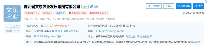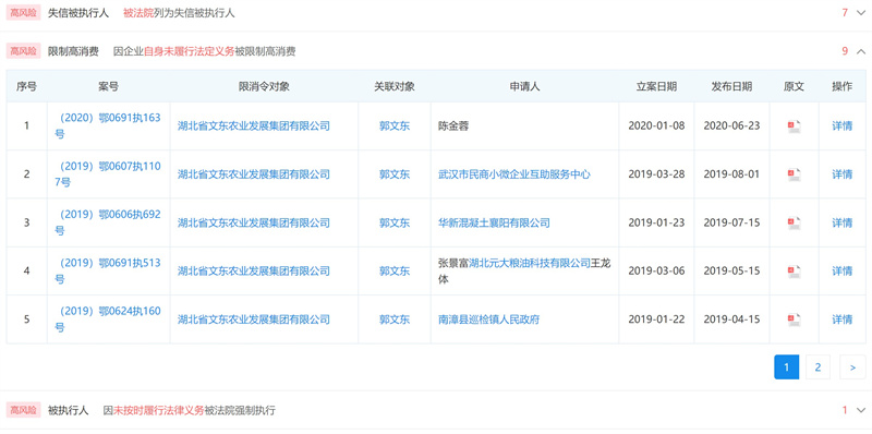 據(jù)調(diào)查,郭文東旗下有6家企業(yè),其中包括湖北省文東農(nóng)業(yè)發(fā)展集團有限公司。該企業(yè)自身風險不斷,在2020年度襄陽市食品生產(chǎn)企業(yè)雙隨機監(jiān)督抽查中被抽查發(fā)現(xiàn)問題。而郭文東作為該企業(yè)的法定代表人,多次被列為失信執(zhí)行人,且因企業(yè)自身未履行法定義務被限制高消費,還因未按時履行法律義務被法院強制執(zhí)行。