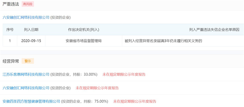 鄧賢炳名下的其他企業(yè)也是問題重重,多家企業(yè)因未在規(guī)定期限公示年度報(bào)告而被當(dāng)?shù)乇O(jiān)管部門列入經(jīng)營異常名錄,值得一提的是,由他投資的六安融創(chuàng)匯網(wǎng)絡(luò)科技有限公司更是早已被安徽省市場監(jiān)督管理局列入嚴(yán)重違法企業(yè)名錄之內(nèi)。據(jù)統(tǒng)計(jì),目前由他擔(dān)任法定代表人的企業(yè)共有4家,其中3家已經(jīng)注銷;由他投資的企業(yè)共有7家,其中有3家已然注銷,還有兩家已處于吊銷的經(jīng)營狀態(tài)。