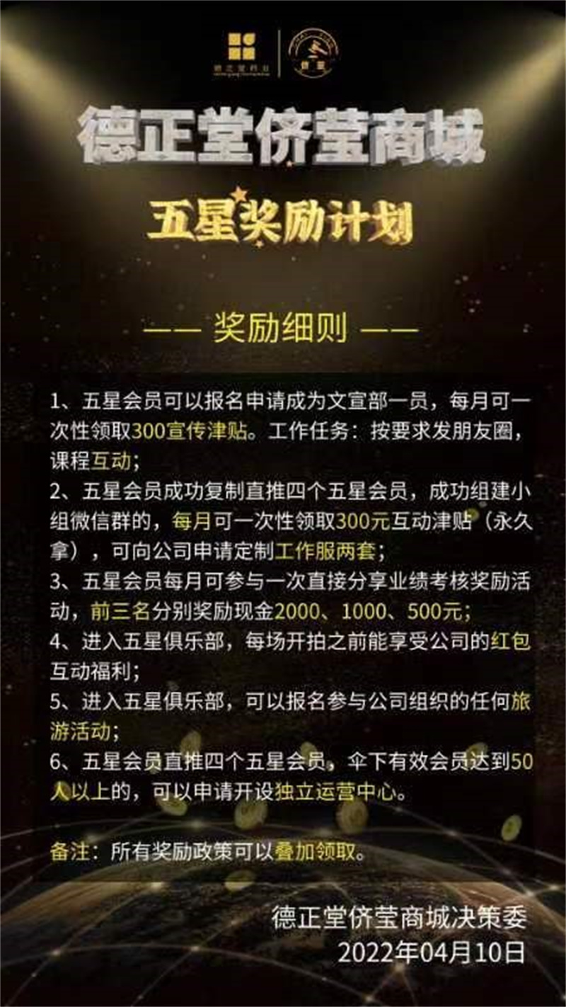 2022年4月10日,為了進(jìn)一步刺激市場,“德正堂儕瑩商城決策委”還發(fā)布了《德正堂儕瑩商城五星獎(jiǎng)勵(lì)計(jì)劃》: