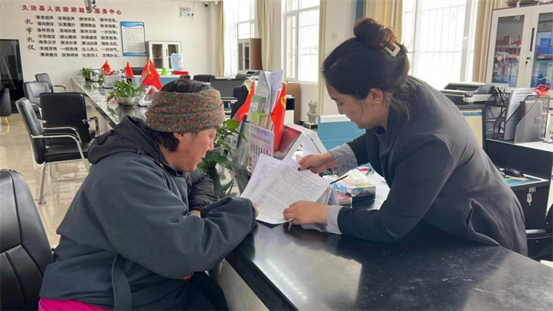 瑪沁縣政務服務大廳醫(yī)保窗口審核員中國人壽壽險瑪沁支公司員工才忠吉經(jīng)常為拉毛杰做審核,她說,今年第一次看到拉毛杰自己拿著報銷資料到窗口時,心中為他的病情好轉(zhuǎn)感到高興。