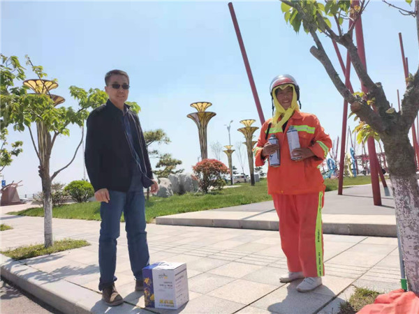“水兵藍(lán)”品牌創(chuàng)始人周學(xué)禮說(shuō):“五一節(jié)期間,這些環(huán)衛(wèi)工作還一直戰(zhàn)斗在一線,為了能讓游客看到潔凈的馬路,他們一直在做著重復(fù)的勞動(dòng),非常辛苦,他們是最美勞動(dòng)者。自己本身是一名退役軍人,對(duì)他們的奉獻(xiàn)精神表示贊賞,用自己精釀的啤酒來(lái)慰問(wèn)他們,希望給他們帶來(lái)五一的快樂(lè)時(shí)光。