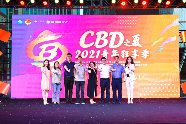 儀式現(xiàn)場,市北區(qū)委宣傳部、市北區(qū)文化和旅游局、市北區(qū)商務(wù)局、共青團市北區(qū)委、中央商務(wù)區(qū)管委會、敦化路街道、中央商務(wù)區(qū)商業(yè)聯(lián)盟、卓越大融城有關(guān)負責同志,一同上臺見證第四屆“CBD之夏·2021青年狂享季”的啟幕。