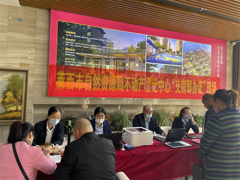據(jù)悉,“交房即辦證”工作是萊西市學(xué)史力行,深入推進“互聯(lián)網(wǎng)+不動產(chǎn)登記”的一項重要舉措。為更好的服務(wù)企業(yè)和群眾,讓百姓買房省心、辦證舒心,萊西市創(chuàng)新“聯(lián)合驗收”,統(tǒng)籌多個部門共同參與,由原來的坐等服務(wù)到現(xiàn)在的上門服務(wù),由原來“折返跑”多部門到現(xiàn)在的多部門集中辦公服務(wù),不僅壓縮了工作流程,而且減少了工作時限。在紫悅璟園小區(qū)交房現(xiàn)場,工作人員通過“一人一機一窗”新模式受理業(yè)主不動產(chǎn)登記申請,經(jīng)不動產(chǎn)登記和稅務(wù)部門后臺人員審核后,申請人在交房現(xiàn)場繳納稅費后直接領(lǐng)到不動產(chǎn)權(quán)證書。兩天時間,共計76戶業(yè)主在現(xiàn)場辦理不動產(chǎn)登記手續(xù)并領(lǐng)取了證書。