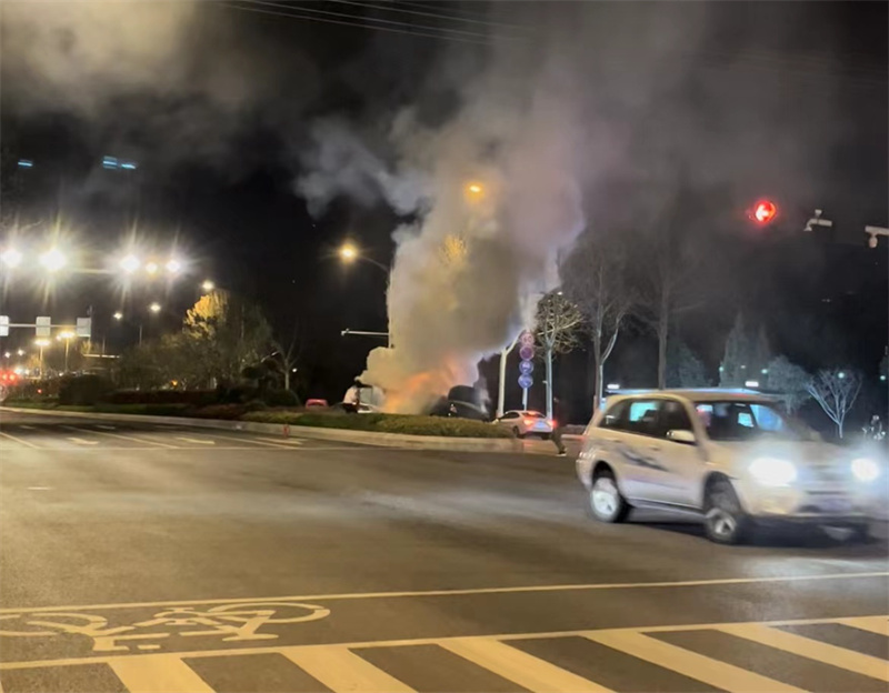 據(jù)目擊者介紹,“凱美瑞”車輛剛剛冒煙,便有一個人從車上跑了下來,隨后“凱美瑞”轎車便開始自燃,并且火勢越來越大,大量煙霧升騰而起,空氣中彌漫著濃濃的焦糊味。目擊者立馬撥打了119報警,而在消防部門趕來期間,兩名見義勇為的市民看到這種情況,立馬停下車,拎起車上的滅火器便開始對起火車輛進行滅火,但火勢異常兇猛,非但沒有得以控制反而越燒越大。