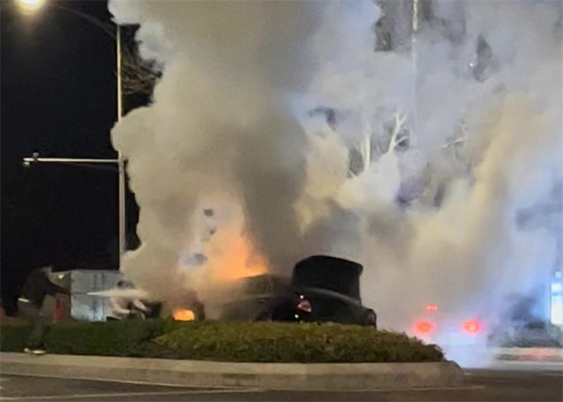> 膠州一黑色“凱美瑞”轎車沖進綠化帶 隨后發(fā)生自燃