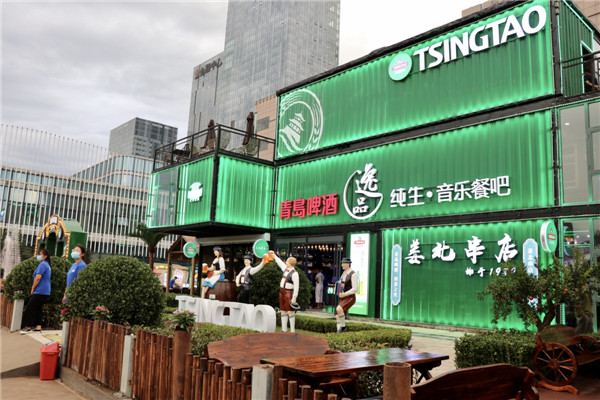 花園負(fù)責(zé)人張相田介紹,今年他們在環(huán)境打造上極力貼合百年國潮的主題風(fēng)格,以國潮風(fēng)+復(fù)古風(fēng)為主進(jìn)行設(shè)計(jì),“我們在一樓的室內(nèi)空間里用3000余個廢舊的啤酒瓶打造了一整面背景墻,在二樓,墻面上的老窗戶都是我們從浙江搜集過來的,都是從六七十年代的老建筑上拆下來,在室外,我們用青啤的文化元素打造了一處文化墻。”