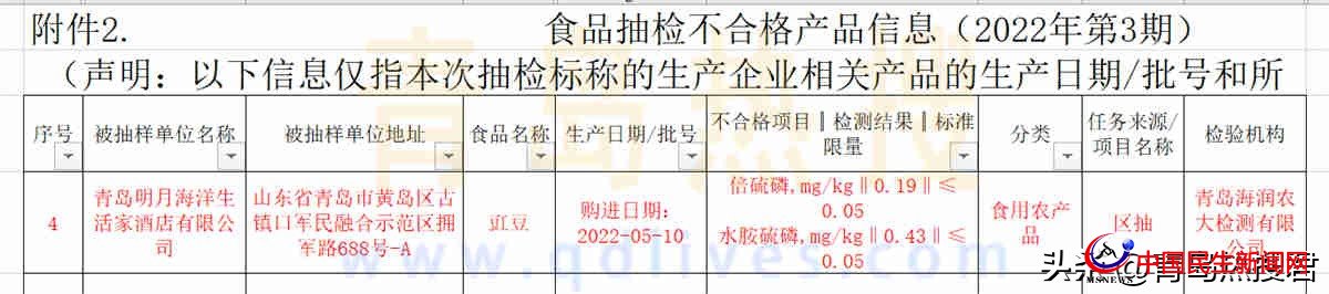 通報顯示,青島明月海洋生活家酒店有限公司采購的豇豆被檢出兩項農(nóng)殘超標(biāo),分別為倍硫磷檢出0.19mg/kg,是限定檢出值的近4倍,水胺硫磷0.43mg/kg,是限定檢出值的8倍多!