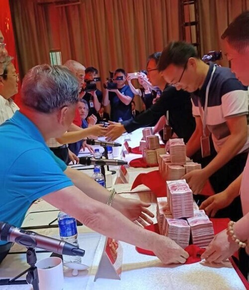 2019年,李士杰組織的首屆“中國書法大廈杯”頒獎現(xiàn)場,以巨額現(xiàn)金進(jìn)行發(fā)放