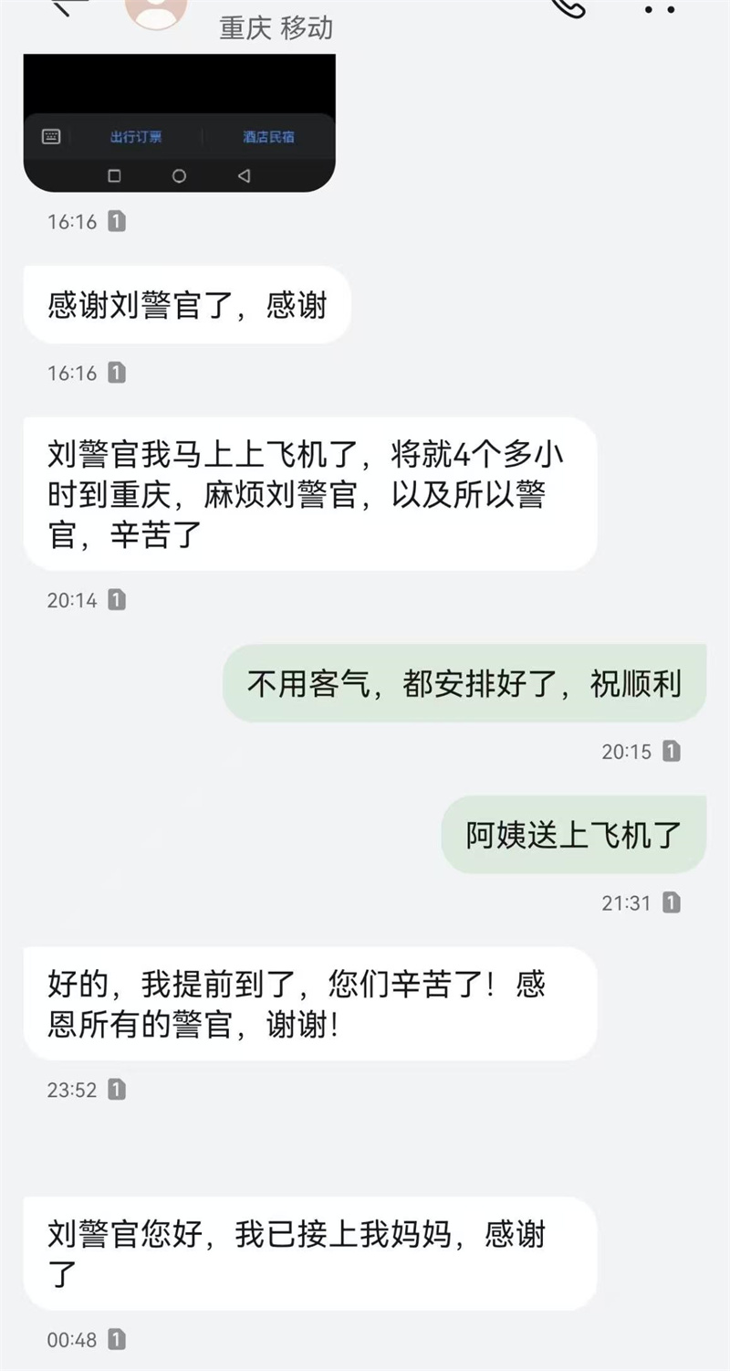 “大娘,別著急,我?guī)湍?rdquo;民警幫助老人在購票平臺查詢、比對了航班的時間、價格,挑選出最合適的航班,幫助完成購票??紤]到老人初次來青且無家人陪伴,民警將老人護(hù)送到登機(jī)口,并與其家人取得聯(lián)系,詳細(xì)告知行程安排,叮囑在重慶機(jī)場做好接機(jī)。臨別之際,老人緊緊拉著民警的手,激動地說:“孩子,太謝謝你了,你們真是人民的好警察!”