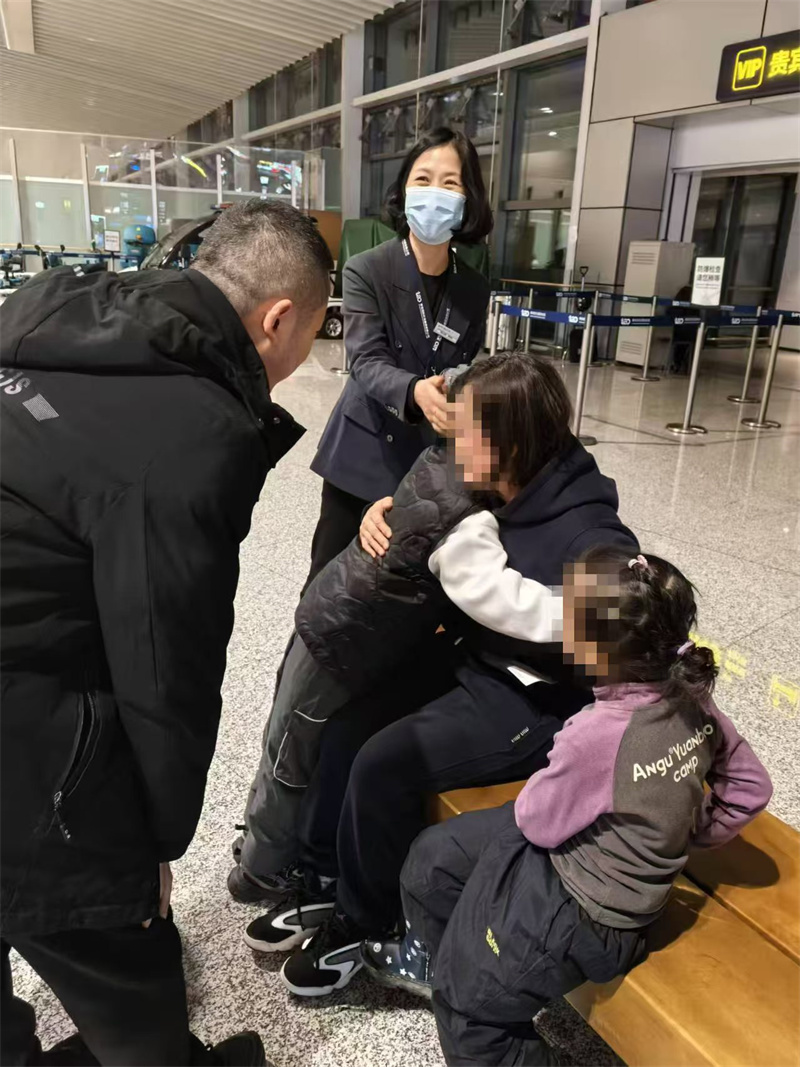 1月15日,民警張雪偉接到機(jī)場工作人員報警稱,發(fā)現(xiàn)王女士與外孫走散,請求幫助查找。“警察同志,我外孫走丟了,怎么辦???”王女士看到民警時都快急哭了。民警了解到王女士和女兒、外孫(哥哥)、外孫女剛從韓國乘機(jī)抵達(dá),期間女兒去買食物,她帶著7歲的外孫(上身著白色T恤和黑色夾克)、外孫女在酒店休息,不想一眨眼外孫不見了。由于女兒之前用的手機(jī)號碼沒有記住,無法聯(lián)系。民警得知后,立即動員機(jī)場工作人員幫助尋找,同時安排輔警查看視頻,組織周邊巡邏警力現(xiàn)場尋找。經(jīng)過多部門協(xié)作,半個多小時后,民警、輔警在航站樓四樓超市內(nèi)找到孩子。經(jīng)進(jìn)一步了解核實(shí),是女兒帶孩子來超市買東西了。隨后,民警帶著2人與王女士匯合,王女士看到孩子歸來,激動地?zé)o以言表、雙腿跪倒,“感謝你們幫我找回孩子,謝謝你們,真的太謝謝你們了!”在場的民警輔警和工作人員立即攙扶起王女士。民警也對孩子和家長進(jìn)行了教育,“孩子正是活潑好動的年紀(jì),出門在外一定要多留心,家人間要保持溝通聯(lián)系。”