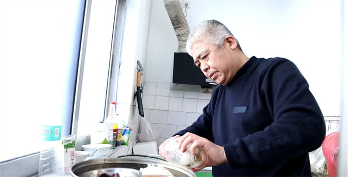 將熱好的西紅柿炒雞蛋、饅頭、熟肉、牛奶等倒入破壁機(jī),打成流食倒入碗中,再將半塊香蕉加入白開水,兌進(jìn)酸奶和膳食纖維,打成濃稠的飲料……3月20日早上,在北墅監(jiān)獄一座年代感十足的宿舍樓里,王海亮正在廚房里忙活著。為了不耽誤上班,每天他都要早早起床,給臥床近19年的植物人妻子準(zhǔn)備餐食。“這些飯是前一天晚上就做好的,是為了節(jié)省做早餐和午餐的時間,每餐都得講究營養(yǎng)均衡,她喝水容易嗆著,加香蕉既能方便吞咽,還能促進(jìn)腸蠕動。”王海亮一邊忙活,一邊告訴記者。