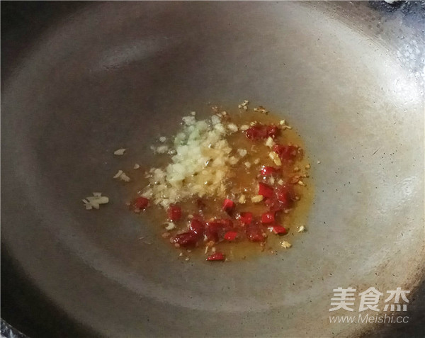 4.鍋中倒入油,待油5成熱時,放入辣椒,蒜爆香。