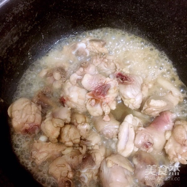 6.雞皮金黃,肉泛白烹入少許料酒,并煮沸揮發(fā)。