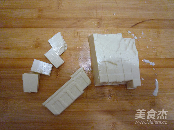3.腌漬蝦仁和雞片的時(shí)候來(lái)處理嫩豆腐,嫩豆腐取出切塊