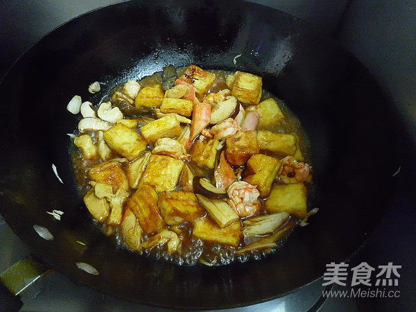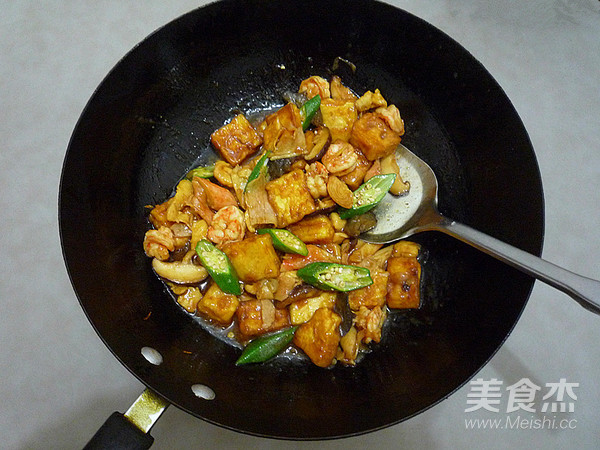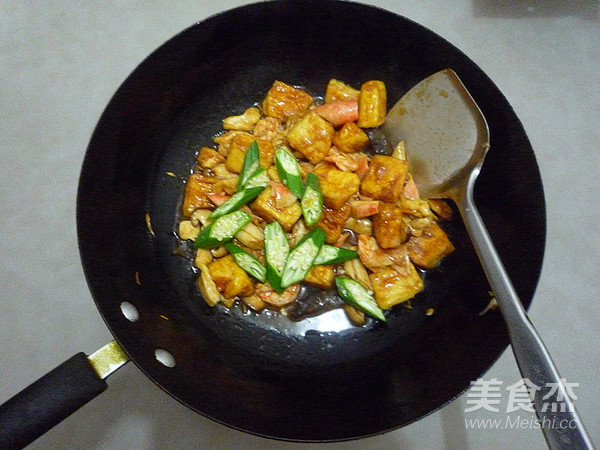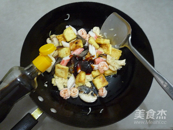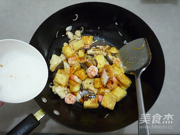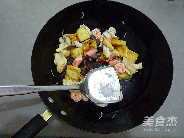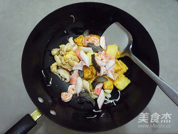 10.炒出香味后,放入炸好的豆腐、滑炒好的雞肉、焯過(guò)水的海參、蝦仁、蟹肉棒等食材。