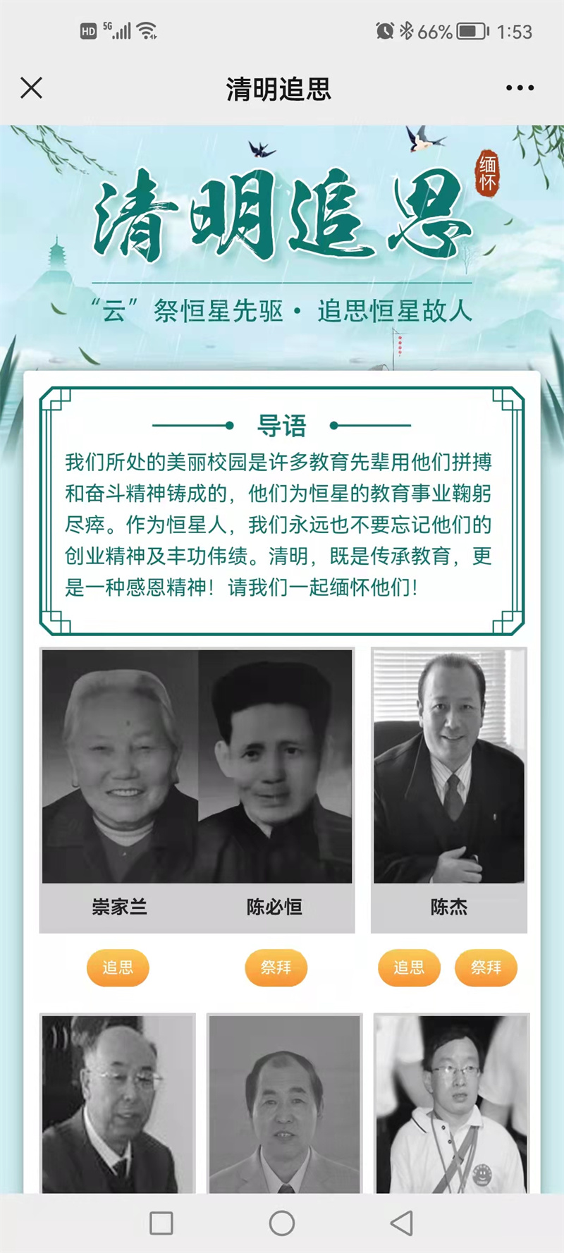 青島恒星科技學(xué)院建校二十余年,在這期間,有十幾位先驅(qū),為了恒星的發(fā)展,他們爭分奪秒、努力奉獻(xiàn),為恒星的發(fā)展壯大奉獻(xiàn)出了畢生的精力和智慧。為了能充分表達(dá)恒星人的對他們的追思,恒星學(xué)院還開設(shè)了專題“云祭恒星先驅(qū) 追思恒星故人”進(jìn)行“云祭奠”活動。此活動得到廣大師生的響應(yīng),他們紛紛進(jìn)入專題,對先驅(qū)們進(jìn)行網(wǎng)上追思和“獻(xiàn)花”活動。恒星學(xué)院師范專業(yè)的張同學(xué)認(rèn)為,他們所處的美麗校園是教育先輩用他們的拼搏和奮斗精神鑄成的,作為恒星學(xué)子,一定不會忘記他們的豐功佳績。如果沒有他們,也許自己就不能在這里安靜地上課和學(xué)習(xí),即使畢業(yè)了,也要將他們的同心同德、自信自強的精神傳承下去。(素素)