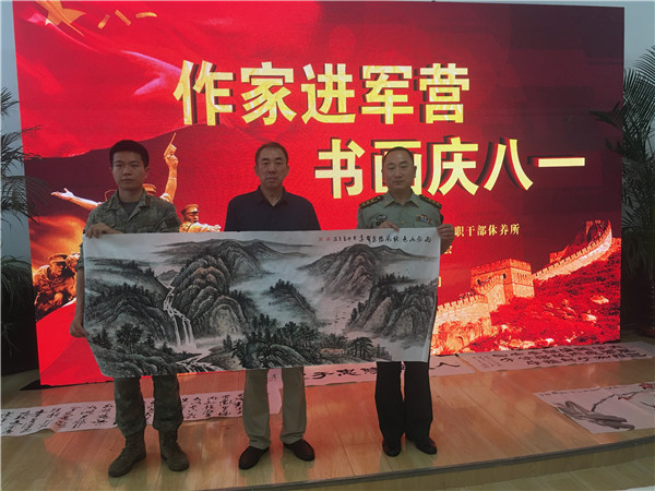 今年是中國(guó)人民解放軍建軍96周年,是延安雙擁運(yùn)動(dòng)80周年和抗美援朝勝利70周年,也是青島市爭(zhēng)創(chuàng)全國(guó)雙擁模范城“十連冠”的迎檢之年。在這樣一個(gè)具有重大紀(jì)念意義的節(jié)點(diǎn),7月26日,市北區(qū)文學(xué)藝術(shù)界聯(lián)合會(huì),市北區(qū)作家協(xié)會(huì)組織作家、畫家、書法家走進(jìn)軍營(yíng)——山東省軍區(qū)青島第十三離職干部休養(yǎng)所,開展“作家進(jìn)軍營(yíng)•書畫慶八一” 文化擁軍志愿服務(wù)活動(dòng)。
