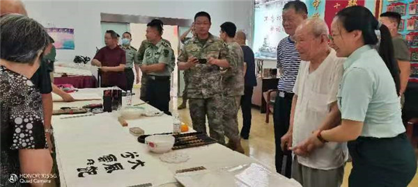 活動(dòng)現(xiàn)場(chǎng),市北區(qū)文學(xué)藝術(shù)界聯(lián)合會(huì)副主席蔣少平,市北區(qū)作家協(xié)會(huì)主席吳寶泉,市北區(qū)作家協(xié)會(huì)秘書長(zhǎng)于凌,中國(guó)報(bào)告文學(xué)學(xué)會(huì)會(huì)員、市北區(qū)作家協(xié)會(huì)理事楚成東,市北區(qū)作家協(xié)會(huì)理事王吉會(huì),市北區(qū)作家協(xié)會(huì)理事宋舒新等作家,向官兵們贈(zèng)送了書籍。中國(guó)書法家協(xié)會(huì)會(huì)員,市北區(qū)作家協(xié)會(huì)會(huì)員尹清深,中國(guó)楹聯(lián)藝術(shù)家協(xié)會(huì)會(huì)員、國(guó)家一級(jí)美術(shù)師、市北區(qū)作家協(xié)會(huì)會(huì)員卜范勛,青島市楹聯(lián)協(xié)會(huì)副主席、市北區(qū)作家協(xié)會(huì)會(huì)員劉寶芝,國(guó)家一級(jí)美術(shù)師、市北區(qū)作家協(xié)會(huì)員高德金,中華詩詞學(xué)會(huì)會(huì)員、市北區(qū)作家協(xié)會(huì)員呂穎虹等十多位知名書畫家現(xiàn)場(chǎng)伏案揮毫,懷著對(duì)人民軍隊(duì)的深情厚誼,書寫、繪畫出了一幅幅浸染著軍魂、信仰和祝福的書畫作品,贈(zèng)送給軍隊(duì)離退休老干部和部隊(duì)官兵。