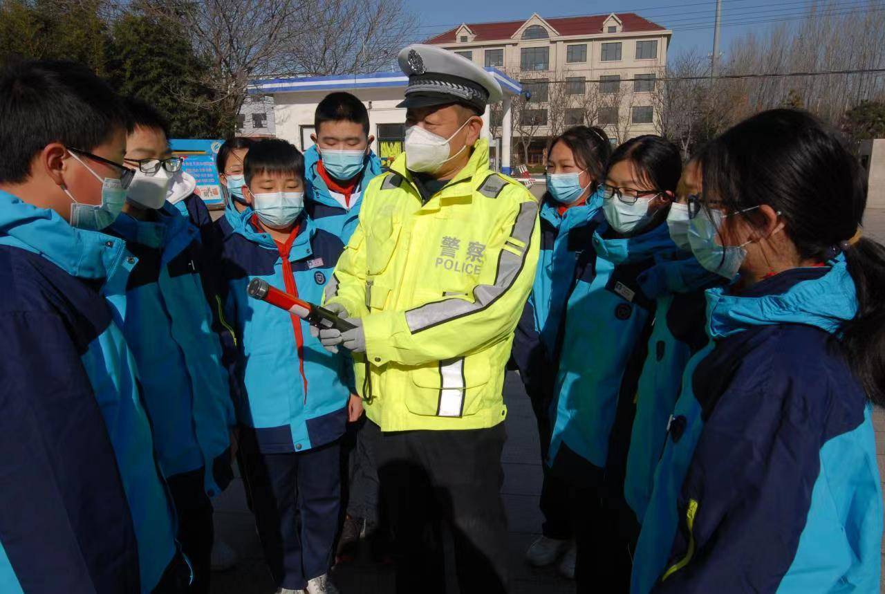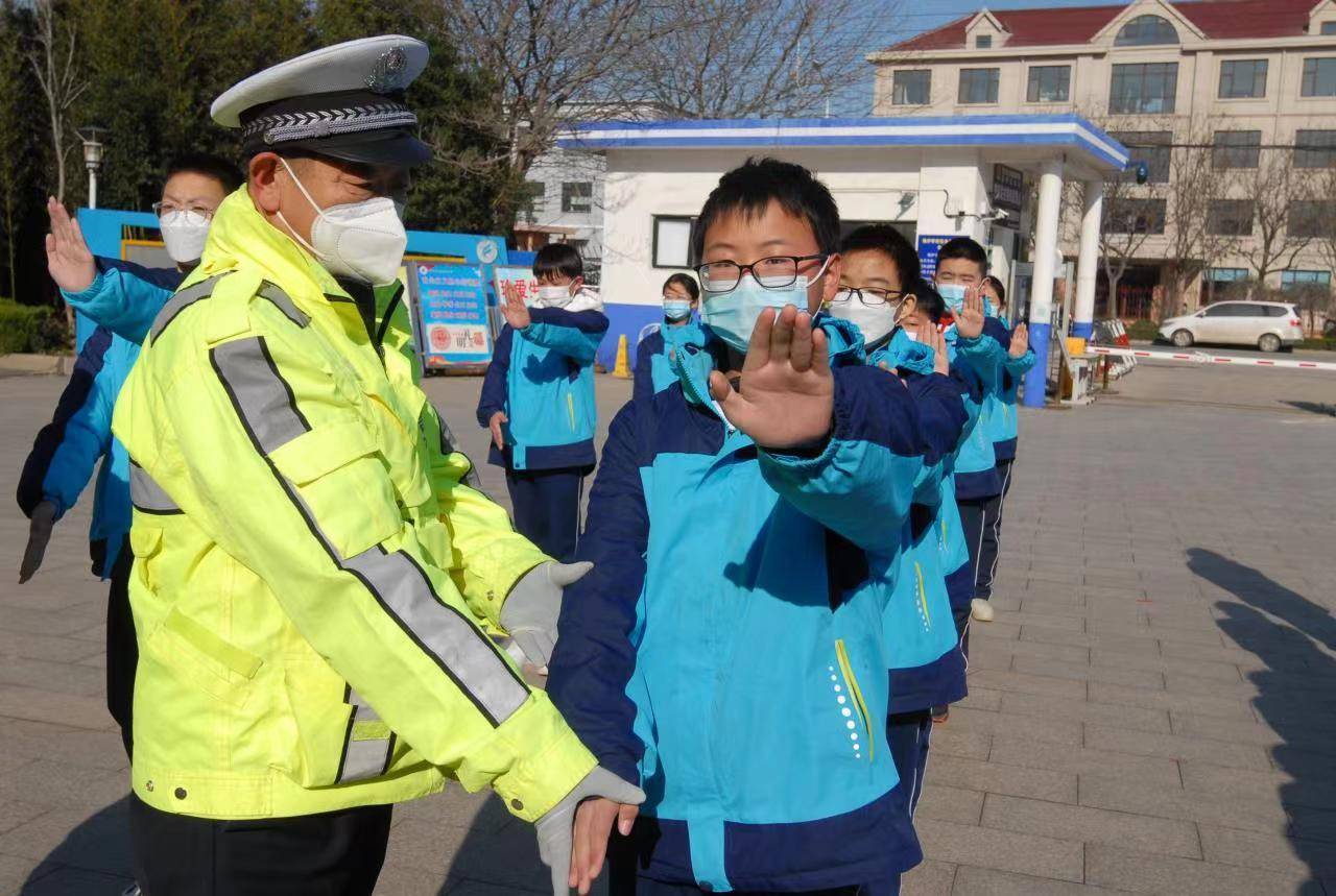 12月1日,山東省青島市即墨區(qū)藍村中學學生在民警的引導示范下,學習交通指揮手勢。