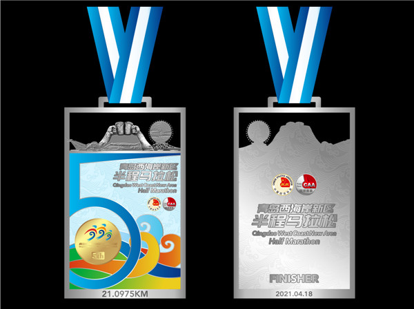 本次賽事的宣傳片、獎(jiǎng)牌及賽事裝備也在發(fā)布會(huì)上亮相。賽事獎(jiǎng)牌紀(jì)念青島西海岸新區(qū)半程馬拉松舉辦5周年,設(shè)計(jì)以青島西海岸新區(qū)的海浪和沙灘為重點(diǎn)元素之一,融合賽事logo色彩,突出展示西海岸新區(qū)地標(biāo)建筑金沙灘啤酒城、鳳凰之聲大劇院、琴島之眼、珊瑚貝橋,將新區(qū)作為海濱城市的特色——山、海、城相擁,島、灘、灣相連表現(xiàn)的淋漓盡致,展現(xiàn)出充滿活力、動(dòng)感時(shí)尚的城市品質(zhì)。本次賽事的半程馬拉松組別完賽獎(jiǎng)牌將采用鑲金設(shè)計(jì),為青島首個(gè)、國(guó)內(nèi)第六個(gè)推出鑲金完賽獎(jiǎng)牌的馬拉松賽事。