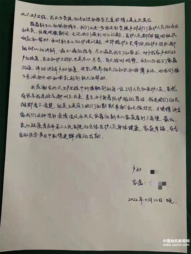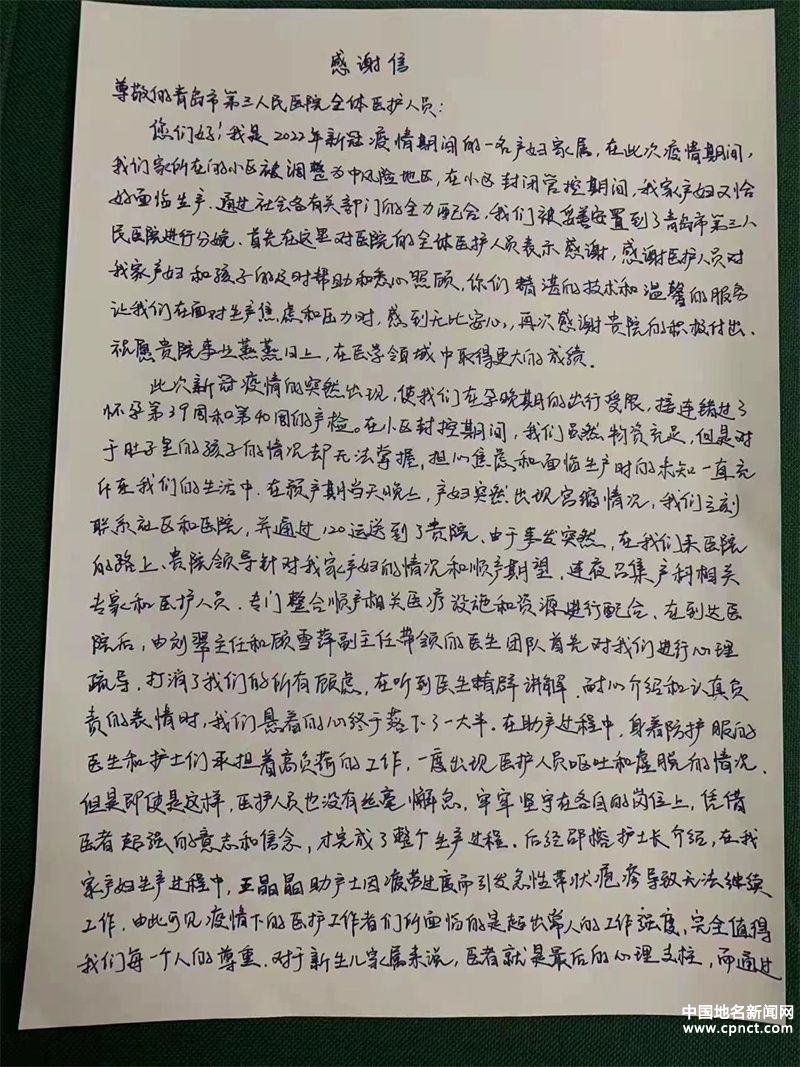 在11月初疫情突發(fā)期間,被封控小區(qū)的市北居民楊先生面對愛人即將臨產(chǎn)的情況向興隆路街道海岸路社區(qū)求助,在市北區(qū)疫情防控指揮部醫(yī)療救治組等有關(guān)部門的全力配合下,楊先生的愛人被妥善安置到青島市第三人民醫(yī)院,順利分娩。近日,楊先生向醫(yī)院送來他于11月10日晚寫下的一封感謝信。