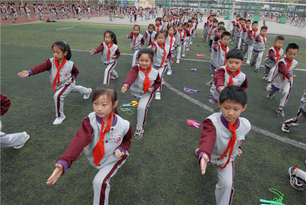 近年來,山東青島市即墨區(qū)第二實(shí)驗(yàn)小學(xué)根據(jù)小學(xué)生的身心特點(diǎn),在緊張的學(xué)習(xí)之余,打造體育特色大課間,利用課間開展跳繩、軍體操、跑步等運(yùn)動(dòng)為主“課間十分鐘”陽光體育鍛煉活動(dòng),讓學(xué)生在享受運(yùn)動(dòng)的同時(shí)愉悅身心、增強(qiáng)體質(zhì)。
