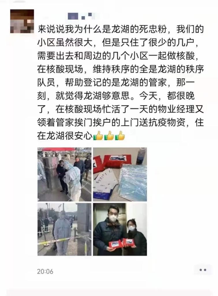 疫情發(fā)生后,山東各地的龍湖項(xiàng)目第一時(shí)間啟動(dòng)防控應(yīng)急預(yù)案,各項(xiàng)目成立防疫專項(xiàng)工作小組,開啟全天候隨叫隨到服務(wù)。全天候協(xié)助社區(qū)核酸檢測(cè),幫業(yè)主代買肉菜等生活必需品并送貨上門;為學(xué)生免費(fèi)打印學(xué)習(xí)資料;幫未入住/未在家的業(yè)主開窗關(guān)窗、澆花、照顧寵物;幫業(yè)主代充水費(fèi)和燃?xì)赓M(fèi);接送行動(dòng)不便的老人出門做核酸等等。