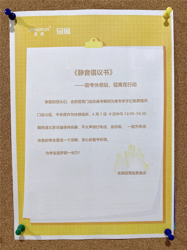 值得注意的是,冠寓在每個(gè)門店都公示了一張“靜音倡議書(shū)”。門店運(yùn)營(yíng)官解釋道:“這是全國(guó)冠寓門店統(tǒng)一的服務(wù)動(dòng)作,除我們自己的工作人員嚴(yán)格遵守外,還會(huì)通過(guò)線上線下的方式向門店租戶發(fā)起倡議——高考期間盡量保持安靜,不大聲接打電話、走動(dòng)等,幫來(lái)店休息的考生營(yíng)造一個(gè)安靜、安心的備考環(huán)境,為考生圓夢(mèng)助一份力。”