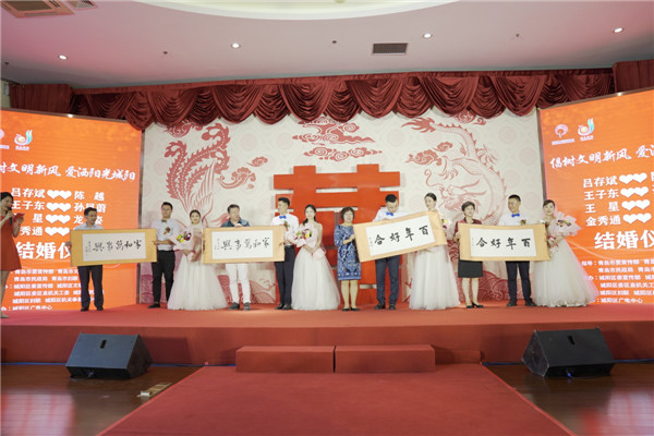 在城陽街道大北曲后社區(qū)民樂團(tuán)志愿者演奏的《喜洋洋》等傳統(tǒng)民樂的暖場下,婚姻輔導(dǎo)師——全國最美家庭代表紀(jì)燕為新人婚前講“家”,幫助新人更好地認(rèn)識和理解婚姻生活。城陽區(qū)民政局局長孫勛先為新人們頒發(fā)結(jié)婚證,區(qū)政府副區(qū)長呂永翠致證婚辭,道德模范代表、中國好人徐立強(qiáng)為新人們送上珍稀植物——山丹百合,市文明辦、市民政局、市婦聯(lián)領(lǐng)導(dǎo)和區(qū)政府副區(qū)長呂永翠分別向4對新人贈送了婚姻箴言書法作品。伴隨著獨唱節(jié)目《陽光家風(fēng)代代傳》、小提琴演奏、快閃《我和我的祖國》,現(xiàn)場的氣氛熱烈而喜慶。儀式最后,新人們與嘉賓、親朋到臺上合影留念,記錄4對新人最美好的時刻。