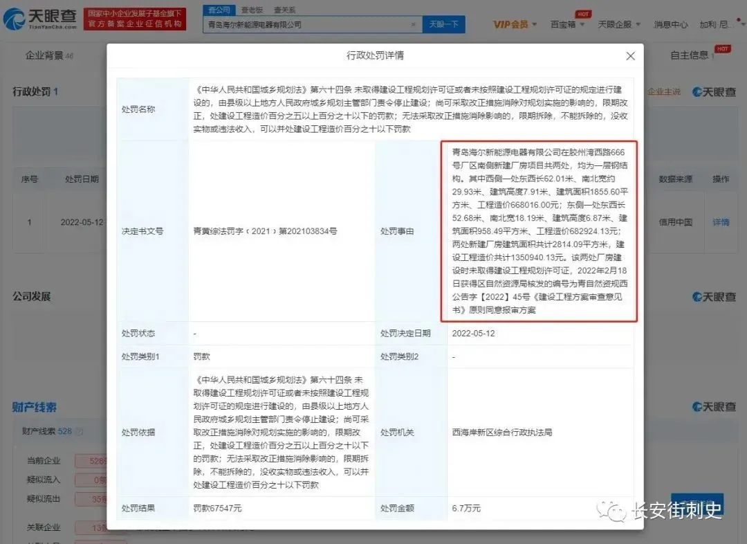 近日,青島海爾新能源電器有限公司因兩處廠房建設(shè)未取得建設(shè)工程規(guī)劃許可證,被西海岸新區(qū)綜合行政執(zhí)法局罰款約6.75萬元。