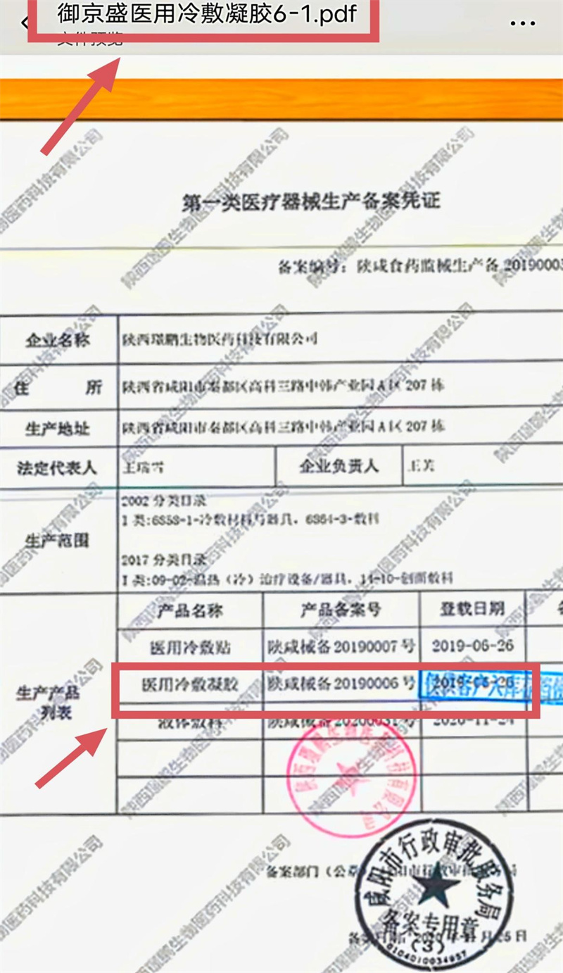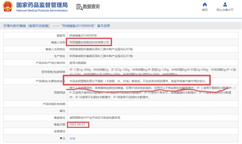 由代理提供的產(chǎn)品備案信息可看到,“御京盛·醫(yī)用冷敷凝膠”的產(chǎn)品備案號為:陜咸械備20190006號。在國家藥品監(jiān)督管理局官網(wǎng)查詢該備案號得到的信息是,該產(chǎn)品的備案人是陜西璟鵬生物醫(yī)藥科技有限公司,備案日期是2022年4月21日,也就是說,該產(chǎn)品是陜西璟鵬生物醫(yī)藥科技有限公司代加工生產(chǎn)的。并且,該產(chǎn)品屬于第一類醫(yī)療器械,由鋁塑瓶和高分子凝膠(卡波姆、水、甘油)等組成,不應(yīng)含有發(fā)揮藥理學(xué)、免疫學(xué)或者代謝作用的成分。用于人體物理退熱、體表面特定部位的降溫,僅用于閉合性軟組織,適用于眼部的冷敷理療。由此可見,“御京盛·醫(yī)用冷敷凝膠”并不具備其所宣傳的治療各種眼疾、近視的效果,其有關(guān)宣傳材料明顯存在醫(yī)療器械廣告宣傳的功能主治、適用范圍超出了批準(zhǔn)的內(nèi)容,含有不科學(xué)地表示功效的斷言和保證,嚴(yán)重欺騙和誤導(dǎo)消費(fèi)者。