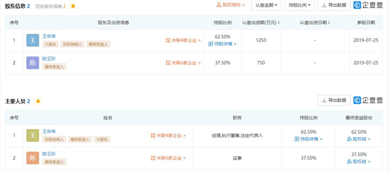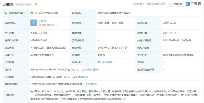 北京九思九如健康科技有限公司成立于2019年7月25日,注冊地位于北京市海淀區(qū)北清路103號3幢一層,注冊資本為2000萬元,法定代表人為王某偉。該公司由王某偉控股62.5%并擔(dān)任執(zhí)行董事兼總經(jīng)理,陳某珍持股37.5%并擔(dān)任監(jiān)事。王某偉是該公司的實(shí)際控制人盒最終受益人。