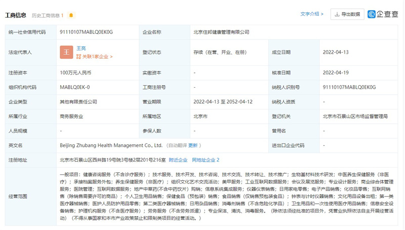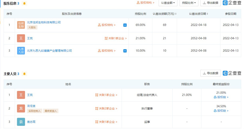 企查查APP顯示,北京住邦健康管理有限公司成立于2022年4月13日,注冊地位于北京市石景山區(qū)西井路19號院3號樓,注冊資本為100萬元,法定代表人為王某。王某擔(dān)任該公司總經(jīng)理,龍某宜擔(dān)任執(zhí)行董事,袁某高擔(dān)任監(jiān)事。該公司由北京住邦生物科技有限公司控股69%,北京九思九如健康產(chǎn)業(yè)管理有限公司持股10%,王某持股21%。北京九思九如健康產(chǎn)業(yè)管理有限公司便是九思九如集團(tuán)旗下公司之一。