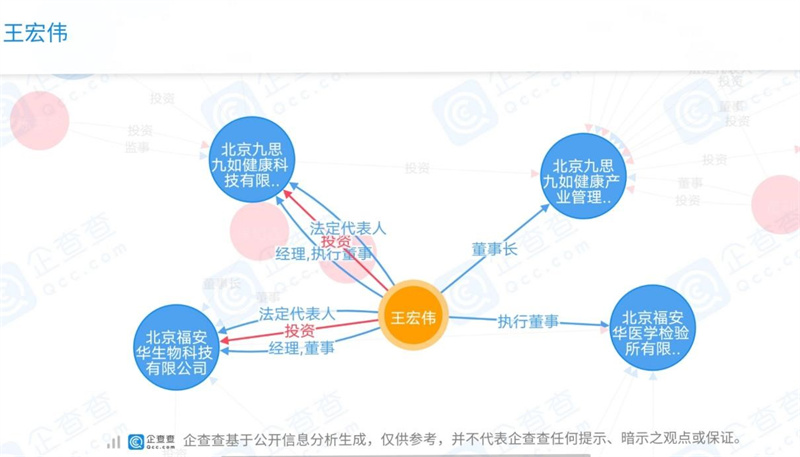 調(diào)查者從代理處獲悉,王某偉就是住邦生物科技的創(chuàng)始人。企查查APP顯示,王某偉與四家公司有關(guān)聯(lián),他不僅是北京九思九如健康科技有限公司董事長,還對外投資了北京福安華生物科技有限公司,持股30%并擔(dān)任該公司法定代表人、執(zhí)行董事兼總經(jīng)理;擔(dān)任北京九思九如健康產(chǎn)業(yè)管理有限公司董事長;擔(dān)任北京福安華醫(yī)學(xué)檢驗(yàn)所有限公司執(zhí)行董事。此外,王某偉還是中金環(huán)球投資基金集團(tuán)的核心成員。
